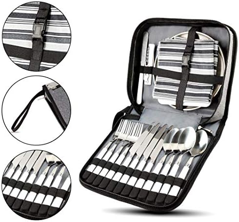 MULTIPURPOSE: Holds all of your important consuming utensils safely in a single safe location, as issues can simply get misplaced simply within the nice open air. The product is brightly coloured and simply recognizable in all environment. Set contains; 4 forks, 4 Spoons, 4 knife’s, 1 butter knives, 4 8″ Stainless Metal dinner plates, 1 slicing board and 1 bottle opener with 4 desk serviette. Excellent for tenting out or picnics in all climate circumstances.